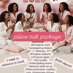 The Ultimate, Stress-Free Girls' Night In! Ready to trade your planning stress for champagne glasses? The Pillow Talk Party package is the perfect blend of cozy comfort and chic luxury, designed for the host who wants a stunning, fully-styled celebration without lifting a finger. We bring the entire vibe—you just handle the guest list and the snacks! This package is ideal for Friendsgiving, birthdays, bachelorette weekends, or simply celebrating friendship in style. What We Deliver (The Vibe): The Look: A spectacular 160-piece balloon arch with custom "Friendsgiving" lettering, plus LED candles, string lights, and ombré leaves to create a dreamy, intimate atmosphere. The Uniform: Luxurious silk pajamas for up to 12 guests (yours to keep!) and a cozy pillow and throw set for the perfect lounge setup. The Setup: A fully styled entrance table, including all the chic disposable tableware, champagne glasses, food pans, utensils, and a drink dispenser—ready for the food you bring! Your only job is to show up, sip, and slay! Please book 1 week in advance so all items can be in stock. $400 deposit to save date & recieve all pj sizes.